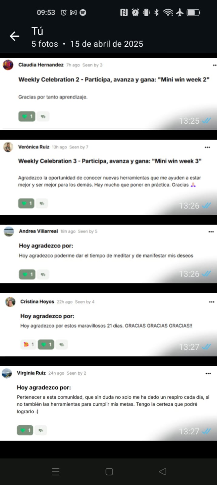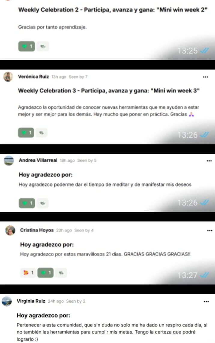 "Agradezco la oportunidad de conocer nuevas herramientas que me ayuden a estar mejor y ser mejor para los demás. Hay mucho que poner en práctica. Gracias 🙏🏼"