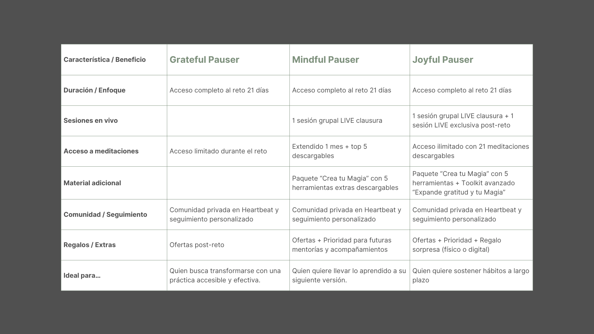 Los tres kits de experiencia incluyen el recorrido completo por tu p.a.u.s.a. challenge. Si lo que buscas es expandir y amplificar tu reto, elige alguna de las opciones Mindful o Joyful para disfrutar de tus bonos extras: